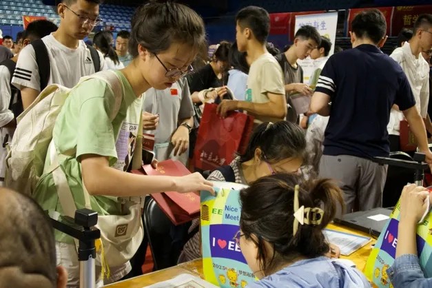 7点25分,信科的第一位新同学报到,渐渐地,越来越多新同学走进邱德拔,像一条条刚上线的数据流,渐次填满馆内的空白。学院老师们带领志愿者有条不紊地核对材料、录入信息、递送礼包、引导签字。场馆内人声鼎沸,志愿者的热情和微笑帮助新生摆脱疑虑、熟悉环境,更加自信地迈向大学生活的新篇章。