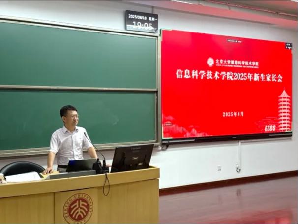 2025年8月18日晚,北京大学信息科学技术学院在理科教学楼207、208分主会场与视频分会场,召开2025级新生家长会,800余名新生家长到场参会。侯士敏院长围绕学院专业设置及人员分布、实验班建设情况进行说明,通报了近年取得的成绩和毕业生去向,并特别提醒家长关注学生在学业、心理、情感等方面的需求。教学副院长陆俊林介绍了培养方案、常用网站、绩点改革的要点以及大学阶段的重要时间节点,并就大学生活向家长们提出“尊重个性化、平等沟通”等与孩子相处的建议。党委副书记贾方健通过数据展示了学院新生情况,并通过“信科十二月”系列活动帮助家长了解学生在校生活与发展。随后,各班班主任、辅导员依次作自我介绍,并与家长面对面交流沟通。