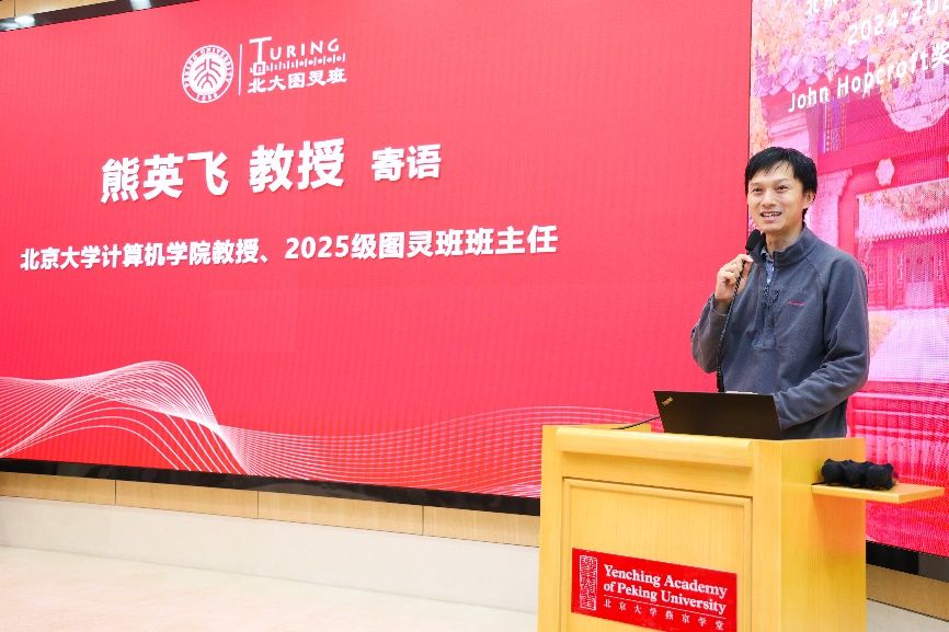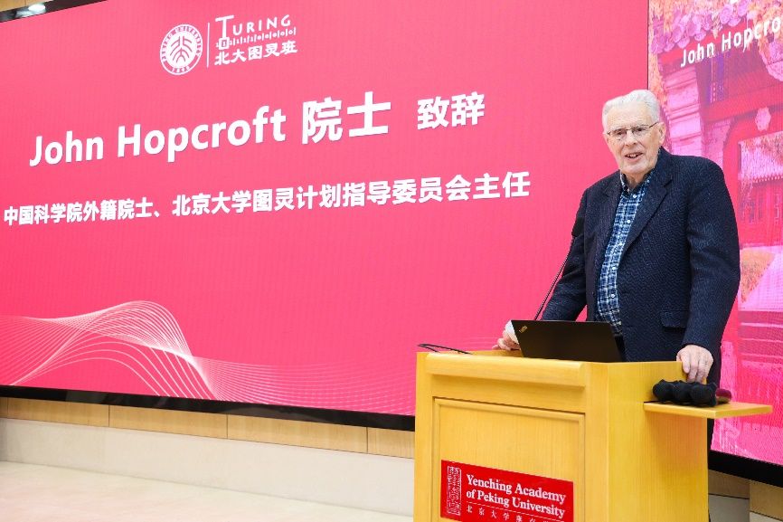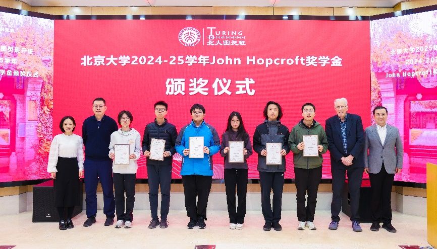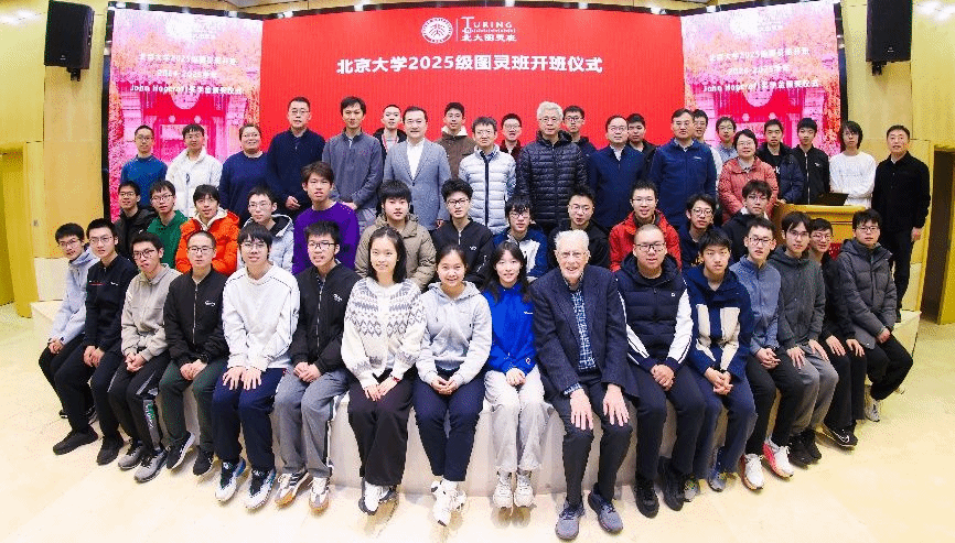 2025年11月25日,北京大学成功举行2025级图灵班开班暨第六届John Hopcroft奖学金颁奖仪式。中国科学院外籍院士、北京大学客座讲席教授John Hopcroft,中国工程院院士高文(通过视频致辞),信息科学技术学院院长侯士敏、副院长陆俊林,计算机学院副院长郭耀,前沿计算研究中心执行主任邓小铁,图灵班班主任代表熊英飞,以及华为、字节跳动、微软亚洲研究院、九坤、商汤科技等捐赠企业代表和图灵班师生共同出席仪式。活动由信息科学技术学院党委副书记贾方健主持。