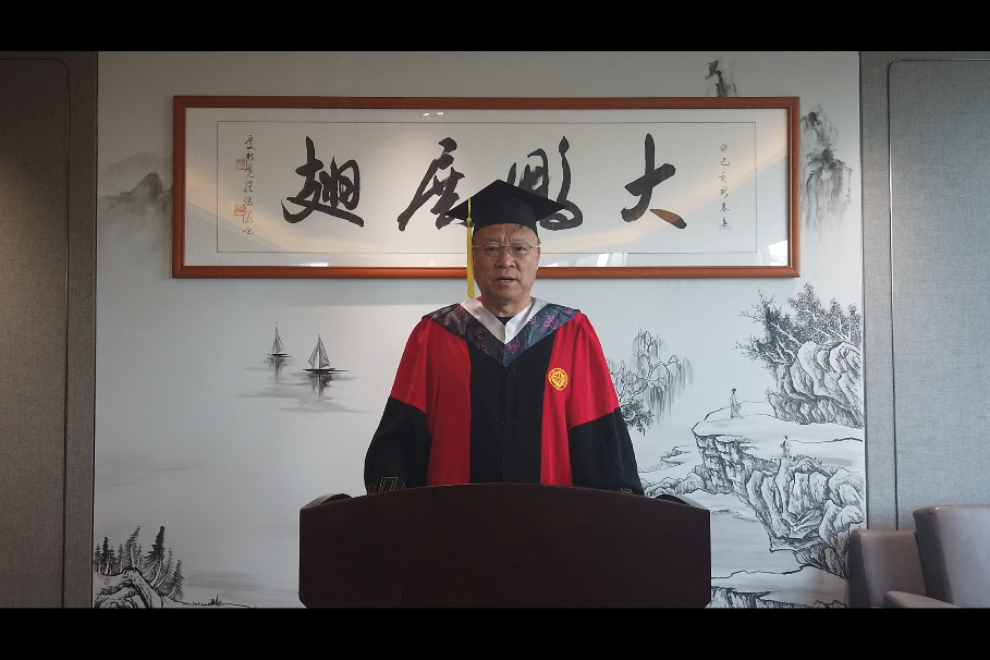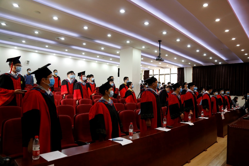 毕业典礼首先播放了毕业生回忆视频。视频记录了本届毕业生在校期间的点点滴滴。从“一二∙九”的歌声到军训时的汗水,从学习生活的紧张充实到“一起运动”等文体活动的欢声笑语,每一位同学都跟随视频回顾了自己美好的大学时光。感动过后,全体人员线上线下齐唱国歌。