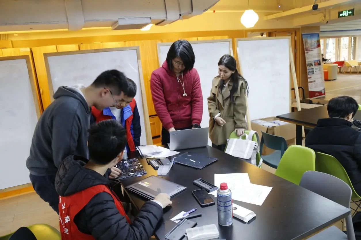 下午2:50讲座结束,本次活动的重头戏电脑维修开始了,志愿者们领取维修物资:螺丝刀、翘片、收纳盒、酒精棉片等。大家各自接单,耐心解决客户的清灰、换硅脂、清理内存等电脑问题。对客户们提出的一些有关电脑基础知识和电脑故障的问题,志愿者们也都互相帮助,热心解答,让参加活动的同学电脑知识都有所提高。维修中志愿者们遇到一些复杂难以处理的问题,经验丰富的孙桐学长也会帮助进行解决。孙桐学长对一些“疑难杂症”的处理也让同学们获益匪浅。活动后,许多客户都对此次服务表示满意。