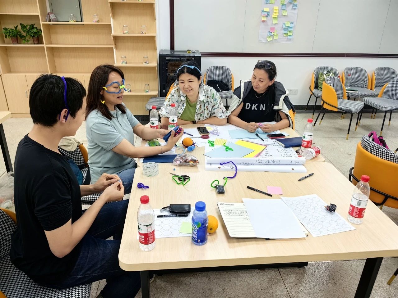 成员们利用现场的物料,将头脑风暴中形成的点子,一个个拼接融合起来,将想法具象化。又通过互相体验,不断优化和改进各组的设计。不同小组之间的交流合作也激发了全新的创意,让解决方案更加的多元化与普适化。