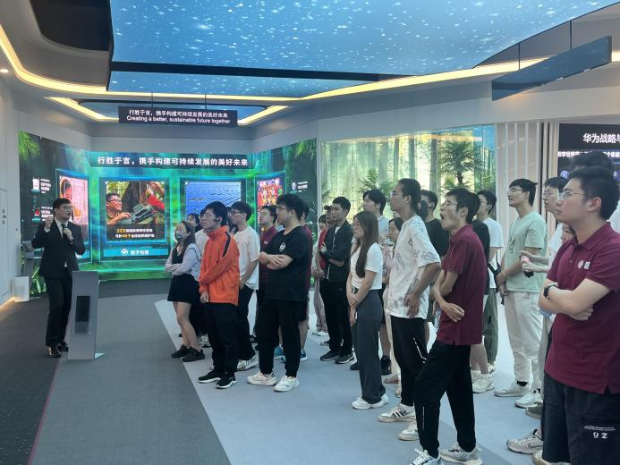 在工作人员的引导下,师生们首先参览华为北研所技术展厅。展厅内,华为的技术人员详细介绍了华为在5G领域的研发成果和行业应用,以及华为在智慧城市、智能交通等领域的创新实践。师生们认真聆听,不时提出问题,与企业技术人员进行深入交流。参览过程中,师生们也“沉浸式”体验了华为的最新数字技术产品。参访后,师生们对于华为的各类解决方案和产品有了更加直观的认识和了解。