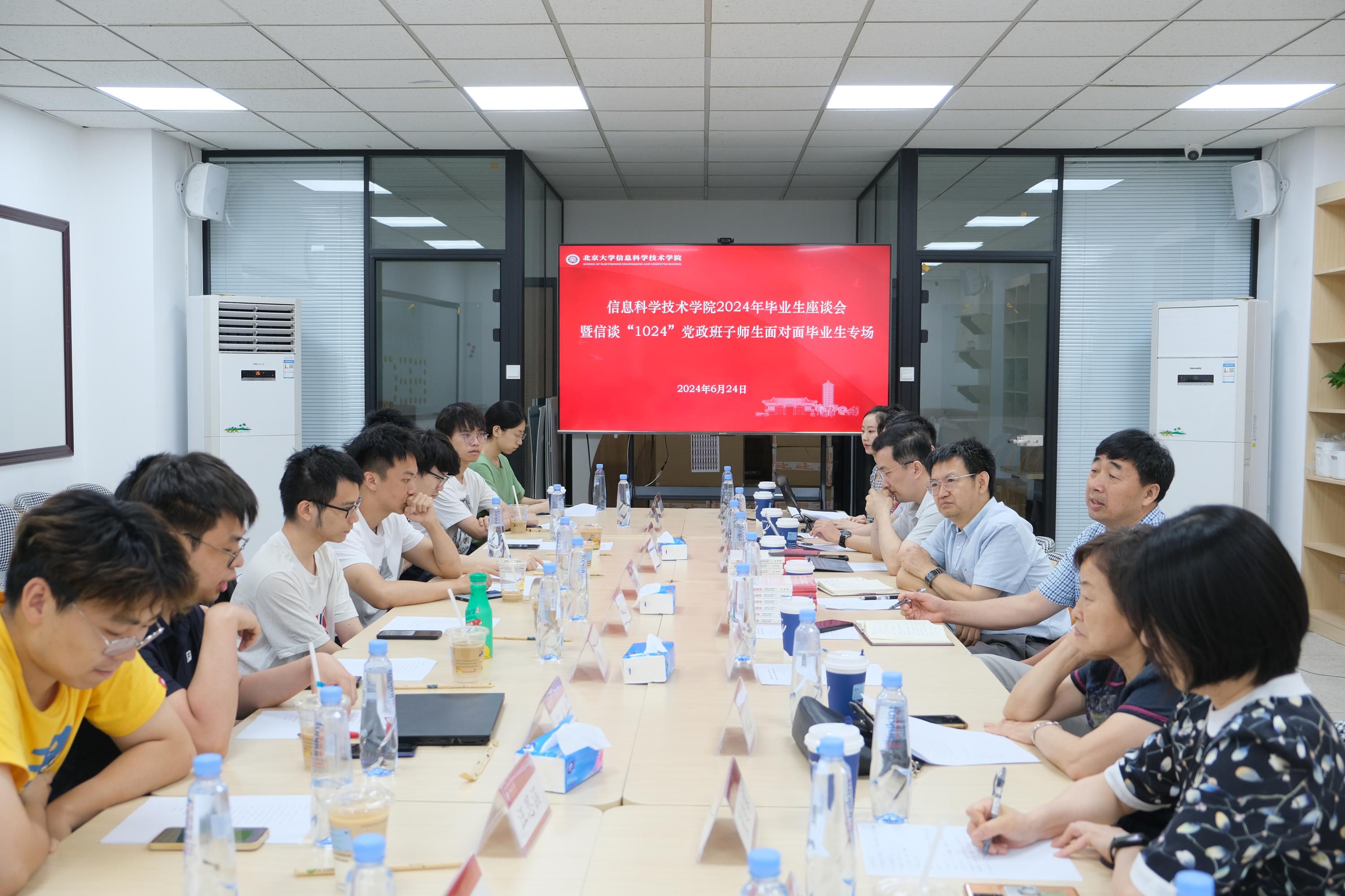 2024年6月24日下午,北京大学信息科学技术学院于理科一号楼1127会议室举办2024年毕业生座谈会暨“信谈1024”党政班子师生面对面毕业生专场活动。学院党委书记严敏杰,院长侯士敏,副院长陆俊林,副院长邓斌,党委副书记贾方健,学院离退休教师代表、关心下一代工作委员会委员刘志敏,教务办主任董晓晖,党政办副主任张铭,学工办主任李子奇,团委书记吕媛,团委副书记刘天怡等学院领导老师,与毕业生代表亲切交流。活动由学工办干部、2020级年级辅导员付晓倩主持。