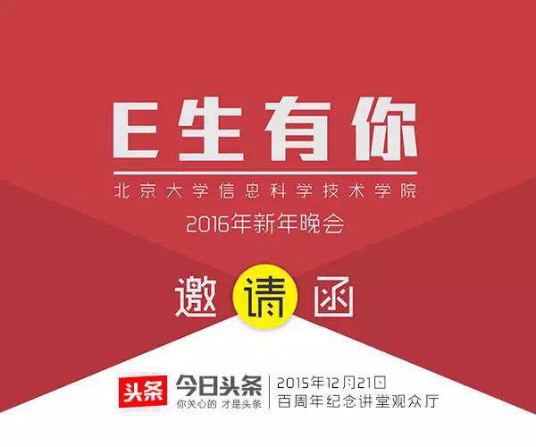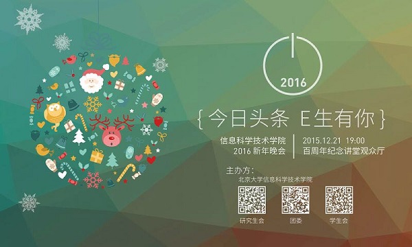 北京大学信息科学技术学院2016年新年晚会,将于2015年12月21日(周一)在北京大学百周年纪念讲堂观众厅举行。