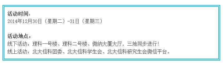 12月29日开始,进入北大信科团委、北大信科学生会、北大信科研究生会任意微信公众平台,回复“答题”即可参与活动,根据提示答题,每人每个平台只有一次机会,答错可以选择其他两个平台继续答题。三个平台分别是简单有趣的脑筋急转弯,信科相关知识,趣味灯谜,总有一款适合你O(∩_∩)O~每个平台只需答对三道题即可收到该平台发的礼物领取码~并回复您的“姓名+学号/工资号”就可以凭领取码和校园卡到任意活动地点领取精美礼物了哟,是不是so easy?!对哒~!就是这么任性~!只要你来玩,我们就有礼物送给你~~~~~~~~~~~~~~