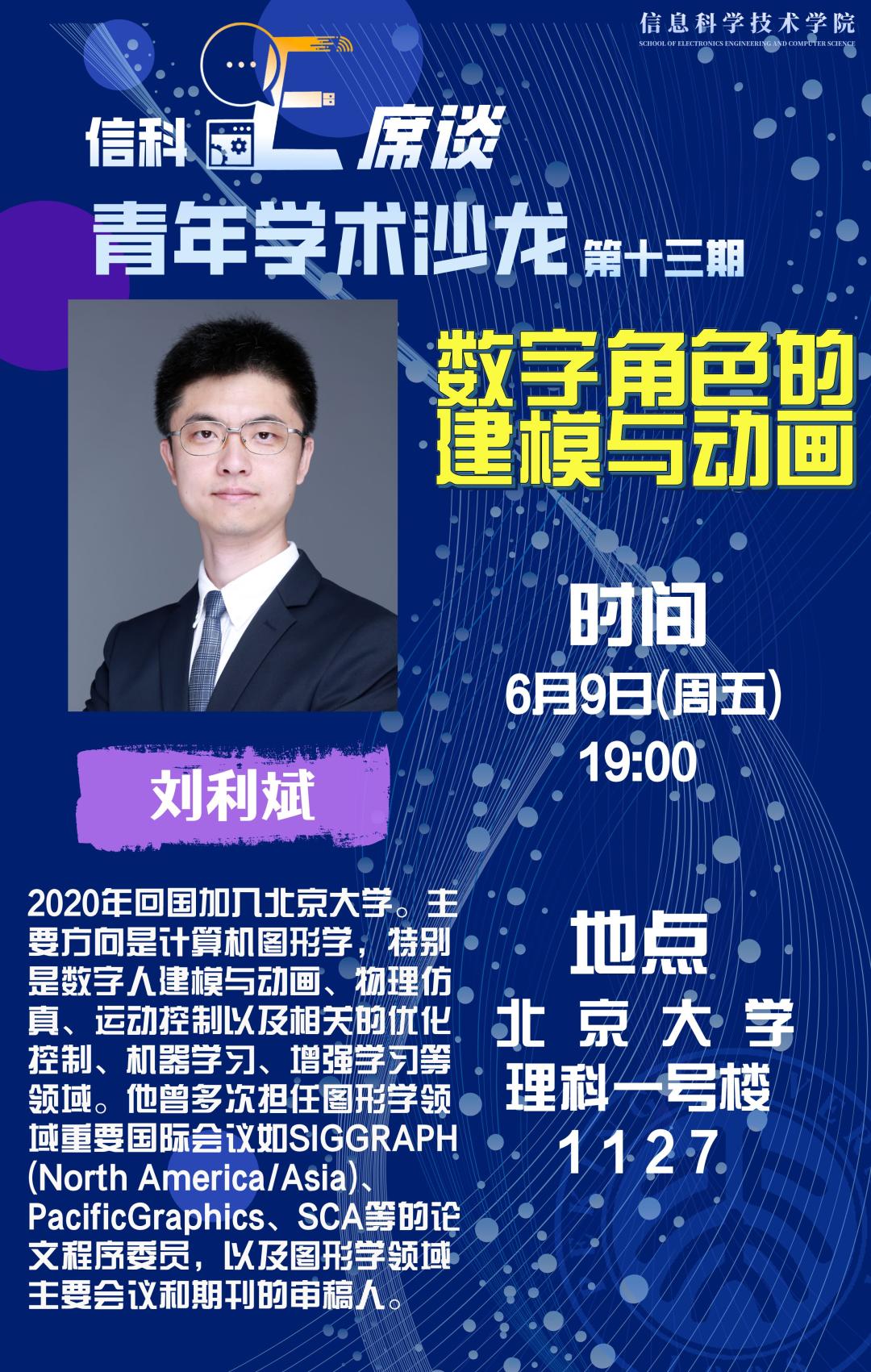 2020年回国加入北京大学。主要方向是计算机图形学,特别是数字人建模与动画、物理仿真、运动控制以及相关的优化控制、机器学习、增强学习等领域。他曾多次担任图形学领域重要国际会议如SIGGRAPH(North America/Asia)、PacificGraphics、SCA等的论文程序委员,以及图形学领域主要会议和期刊的审稿人。