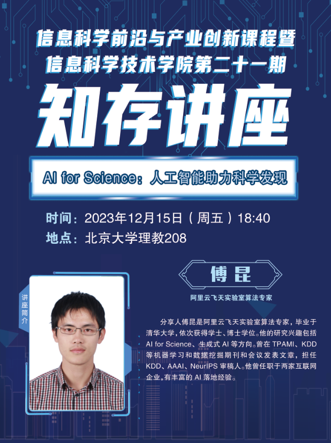科学发现经历过实验归纳和理论演绎两个重要阶段后,计算和智能方法开始扮演越来越重要的角色。以AlphaFold2为代表的人工智能方法,近年来在生物、药物、化学等传统科学领域起到了重要的推动作用,使得科学发现的速度不断加快。本次报告将首先介绍AI for Science的概念和整体背景,然后选择了蛋白质结构预测、AI加速药物发现以及语言大模型等典型应用场景,依次介绍它们的问题背景和AI解决方案,以点带面展示AI对于科学发现的重要意义和巨大应用潜力。
