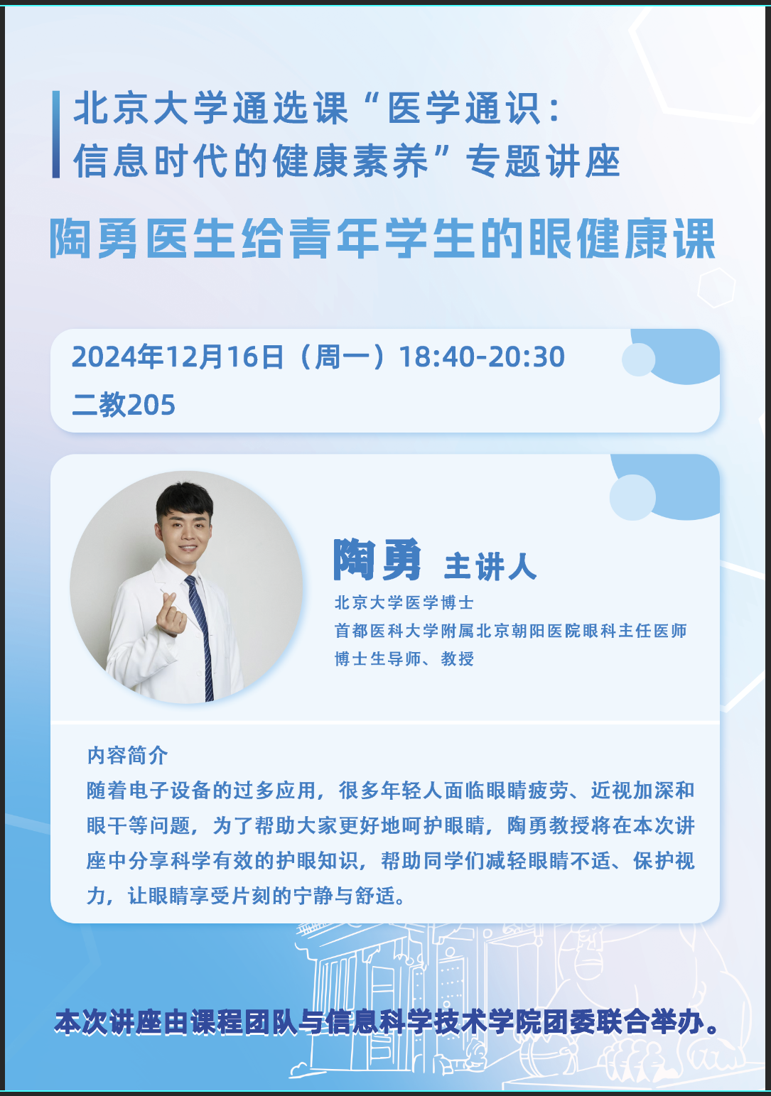 本次讲座是通选课“医学通识:信息时代的健康素养”中的一场特邀专家讲座。本课程由信息科学技术学院陆俊林教授和北医三院薄世宁主任医生联合开设,讲授医学和科技对现代生活的影响。每学期的课程中会邀请知名专家安排一两次专题讲座。本次迎来了一位重量级嘉宾——眼科医生陶勇教授,他将为大家开设专题讲座“给青年学生的眼健康课”。讲座聚焦现代青年学生在信息时代普遍面临的眼健康问题,让同学们了解和掌握眼健康相关的科学原理和科研前沿进展,同时帮助同学们科学护眼、改善用眼习惯。